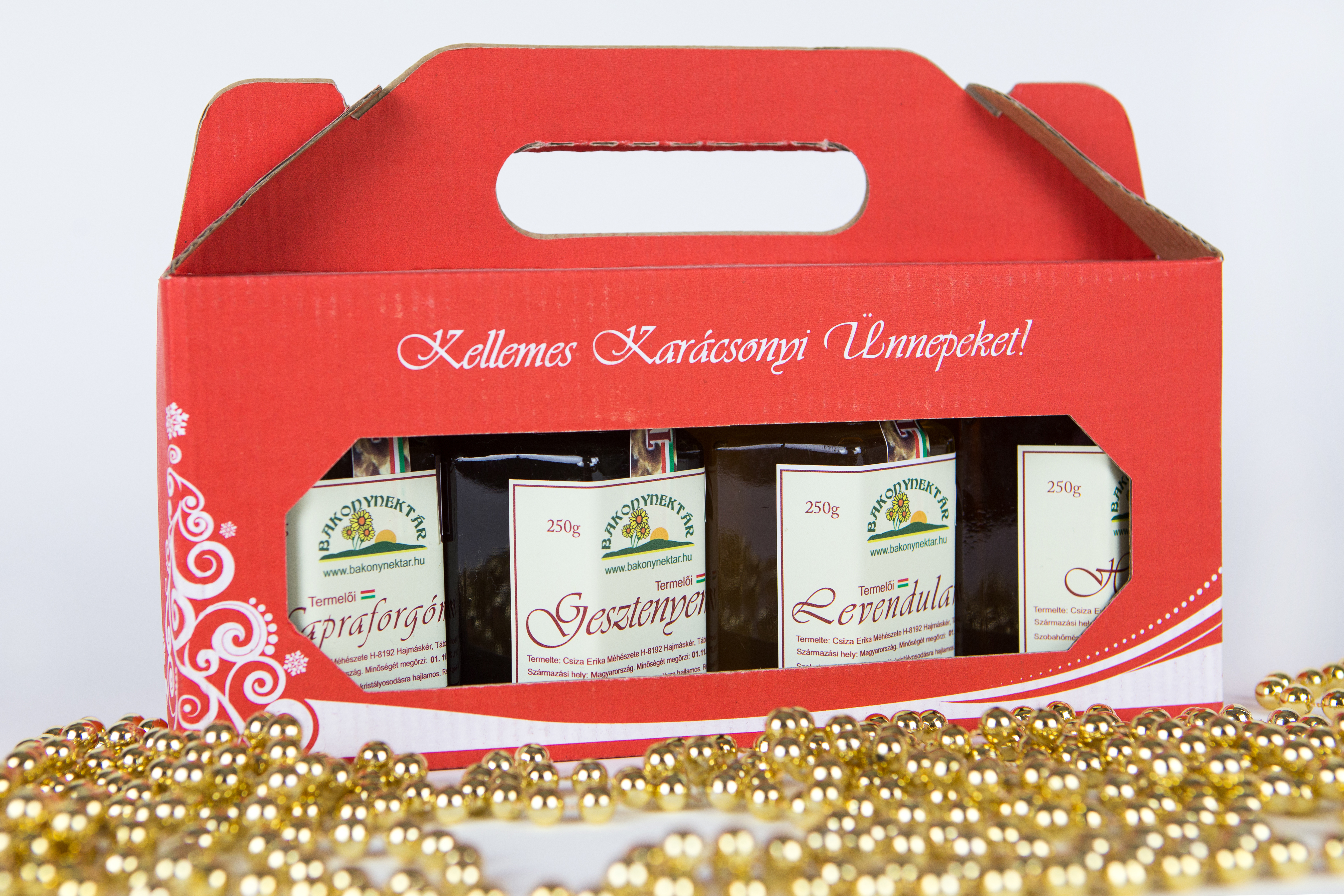 Ezek a színes karácsonyi ajándékcsomagok 3 vagy 4 db 250 g-os hatszögletű üvegbe csomagolt mézet tartalmaznak, az Ön ízlésének, kérésének megfelelően.